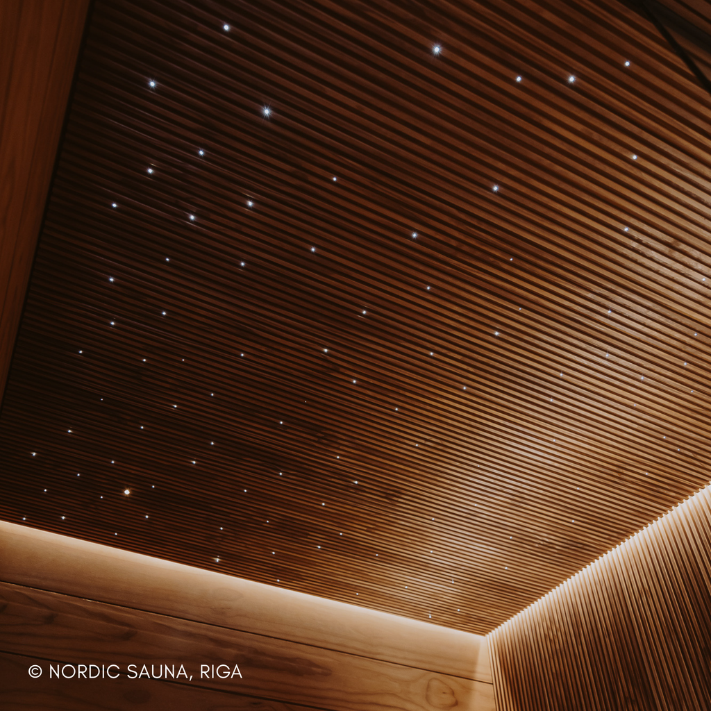 Choosing the right sauna ceiling lighting is the best way to add both atmosphere and functionality to a space. Indirect, even lighting gives the sauna a calm and soft atmosphere without glare. The Starry Sky ceiling lighting set will delight with its magical starry sky effect, making every sauna experience special. Dotted ceiling spots are not just for spotlighting, they can also be used to create atmosphere. For example, they can be used to highlight a stove. When choosing sauna ceiling lighting solutions in particular, it is important to consider durability and safety in the hot and humid conditions of the sauna.